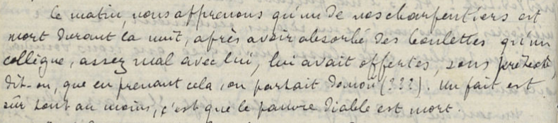23 sept. (…) Ce matin, nous apprenons qu’un de nos charpentiers est mort durant la nuit, après avoir absorbé des boulettes qu’un collègue, assez mal avec lui, lui avait offertes… sous prétexte, dit-on, qu’en prenant cela on partait domoï ( ???). Un fait est sûr tout au moins, c’est que le pauvre diable est mort.
